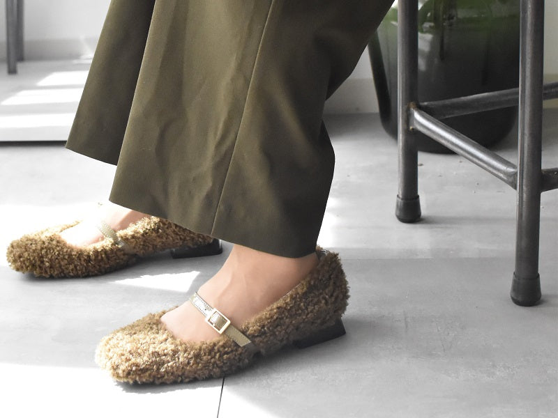 毛足の長いモケモケ素材で作られたメリージェーンシューズ。シンプルなデザインだからこその遊び心満載のアイテム。トップスやアウターもモケモケ、モコモコ素材が多く出ており今年のいち推しトレンド素材です。比較的様々なコーディネートにも併せられますが、オーバーサイズのパンツとの相性が一番良いような気がします。